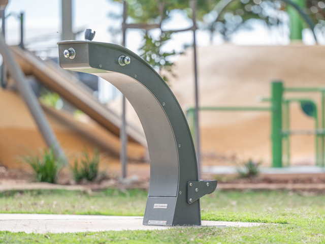 For accessibility and durability, the precinct includes a Reviva drinking fountain with an arched profile for wheelchair under-access, and Atessa dual bin enclosures finished with vandal-resistant powder coating and hardware.