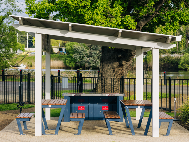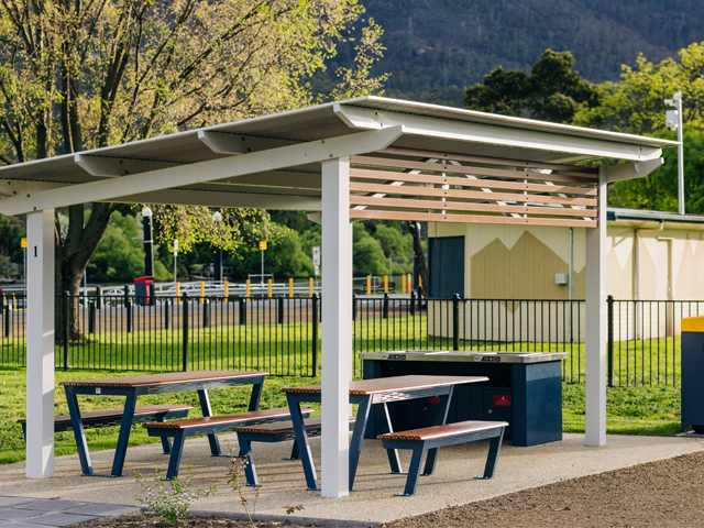 Derwent Valley Council installed the GX Outdoors Contour BBQ powder coated in Deep Ocean blue, both being a part of the Easy-Access range. These BBQs were installed underneath the GX Outdoors Akora Skillion Shelters to provide a weather-proof cooking area while providing shade to families as their children interact with park equipment and their natural surroundings. Streetstyle table settings with wheelchair accessibility were placed underneath the shelters to help form an inclusive environment for park users. Streetstyle park seats and benches have been used as resting places along the Esplanade. An Eco-Drinking Fountain was supplied by GX Outdoors, too, with a dog bowl attachment.