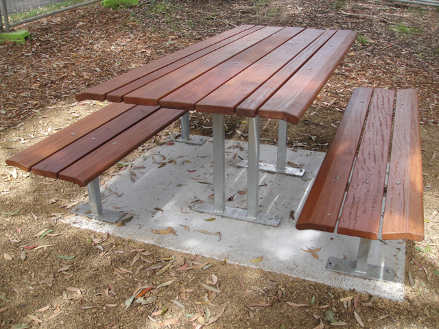 Table settings: Park table settings with galvanised steel surface mount or sub-surface in-ground mounted frame using select grade hardwood.