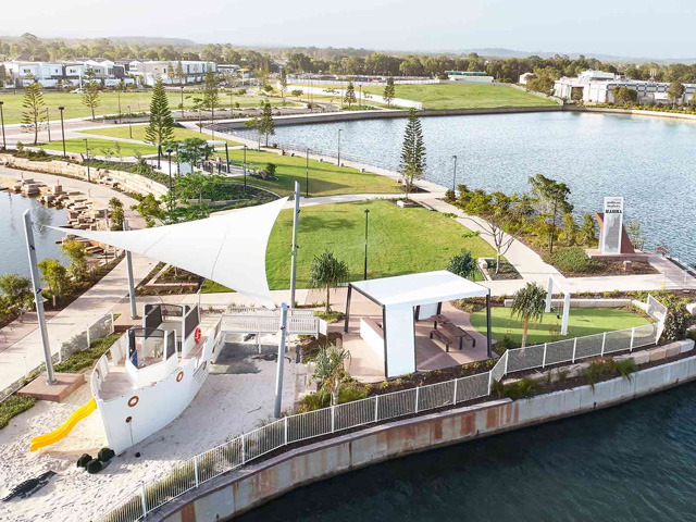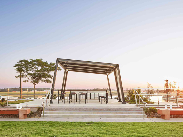 The overarching coastal theme of the design is evident in the forms of the shelter, taking cues from a typical ‘beach day shelter’ that helps to frame the view across the park and surrounding canals. The refined shapes are explored in various forms and repeated throughout the full suite of furniture and shelters. This was done intentionally to create a unique and interesting public space that visually ‘shifts’ in a dynamic way as the users engage with and move through the park. Due to the overwhelming success of the design Street + Garden are delivering future stages for this project.