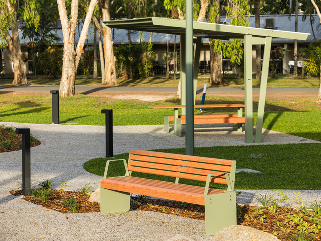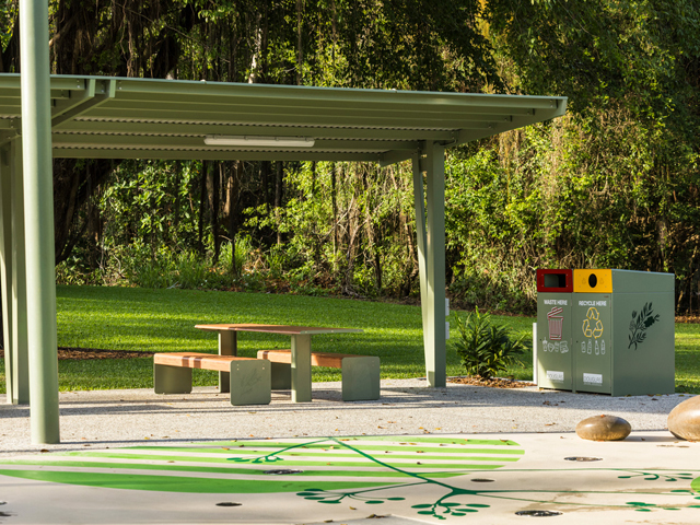 GX Outdoors supplied a cohesive suite of products that deliver durability, functionality, comfort, and longevity. Designed for coastal performance and aesthetic cohesion, the installation included Riverside Cantilever Shelters, Hyve Table Settings and Park Seats featuring TimberImage™ slats, Integra Ex Bin Enclosures and Frontier BBQs. Incorporating semi-custom laser-cut designs, the furniture ties seamlessly into the tropical surroundings, adding a creative layer that reflects the park’s natural identity and enhances sense of place.