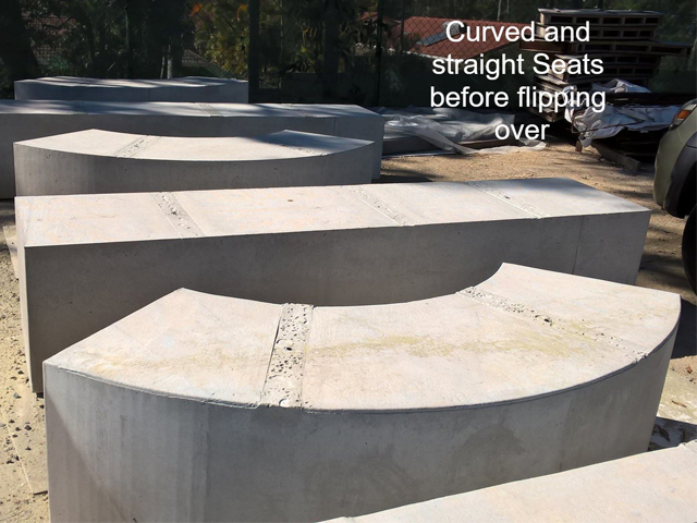 Benzini also created straight and curved seats. Instead of pouring the concrete into patterned moulds, they added sleek timber battens that add warmth and colour to the whole area. The two shapes allow these seats to be installed along a curved lawn and adding another design element to this shared space.
