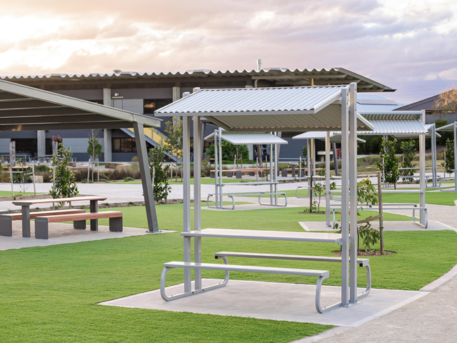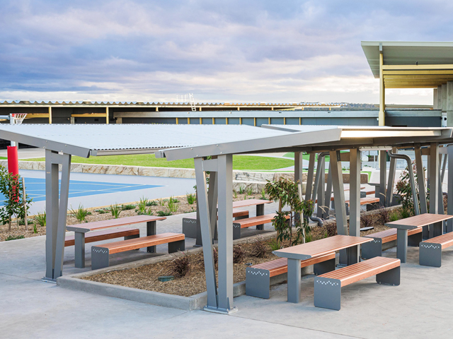 GX Outdoors were proud to be part of this project by supplying a tailored suite of outdoor furniture and shelter solutions. Each product was carefully selected to align with the school’s vision for a flexible, future-ready campus, delivering long-term, low-maintenance, weather-resistant products. The Red Gum and Riverside Cantilever Shelters provide year-round protection and help define key gathering areas across the grounds. The Metro Table Setting and Shelters create compact breakout spaces for student connection. Hyve Table Settings support outdoor study and social activity, while Bench Seats offer durable seating for everyday use. Integra EX Bin Enclosures were also installed throughout the grounds, supporting a cleaner, more sustainable learning environment.