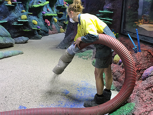 The project included the installation of special quartz pebbles to be installed on the base of the refurbished enclosure. The setup involved running the pebbles through the rockslinger machine to wash them before loading the powerful blower truck. The truck then parked outside the building, running hoses through internal spaces to access the amazing turtle enclosure. This required unique skills and equipment to blow in the pebbles quickly without mess or fuss.