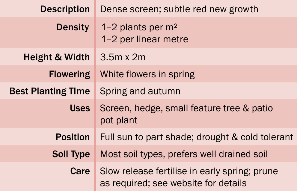 • Its natural height and ability to grow into a screen relatively quickly makes it perfect for heights of 1.8 metres to 2.5 metres.