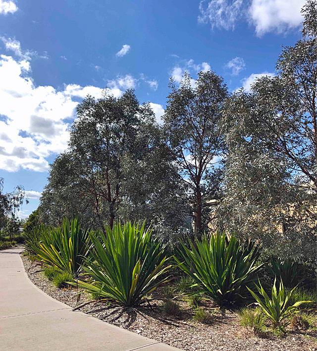 Rough fissured bark is now developing and offsets nicely with the softly weeping foliage. The trees have also retained the silvery blue foliage colour that makes this tree so desirable in the landscape. This silver colour works well in contrast with the strong greens at ground level.