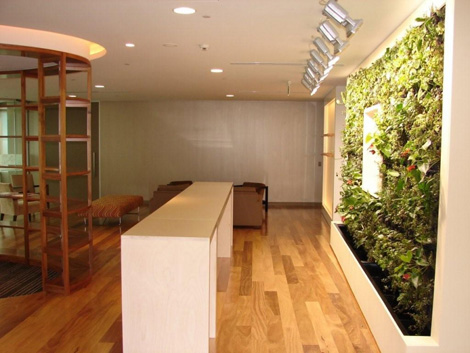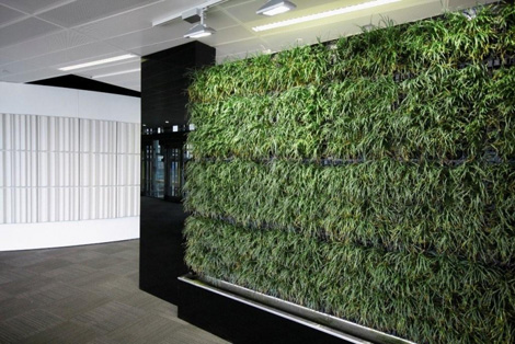 The offices of Fujitsu in the Melbourne Docklands area is one of Australia’s first 6-star rated sustainable buildings including a monoculture of Mondo grass as a green wall. The walls are made up of a series of modules that are pre-grown off site to ensure the plants establish successfully and then moved into place when required. The modules are grown outside or inside under metal halide grow lamps depending on the final requirements. In order for Greenrooms/Junglefy to offset their carbon production, the electricity used is sourced from a 100% renewable source through Energy Australia.