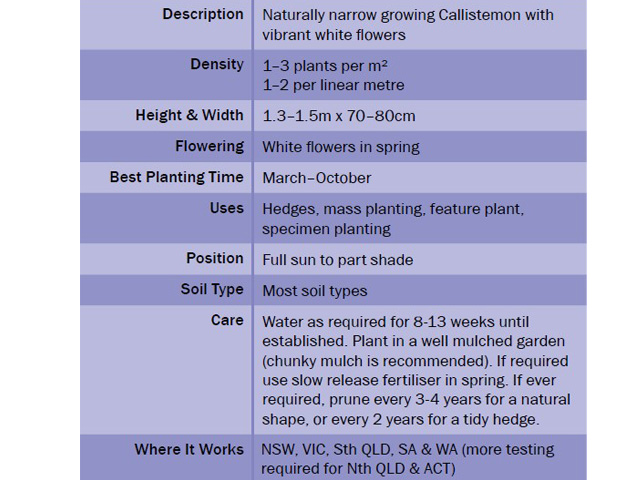 Naturally narrow growing Callistemon with vibrant white bottle brush flowers.