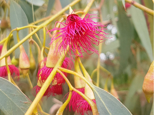 This tree has a smooth trunk with cream to grey coloured bark which sheds in flakes. It has narrow shaped green leaves and as it matures, forms a large open canopy. From Autumn to Spring, an abundance of red flowers appear in clusters of three attracting a variety of birdlife.