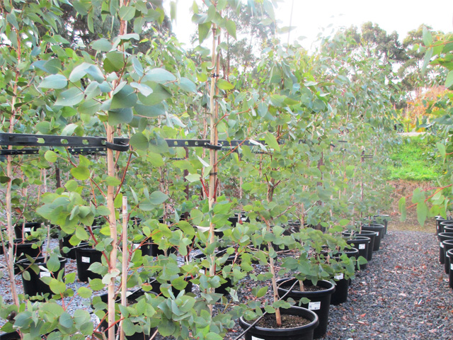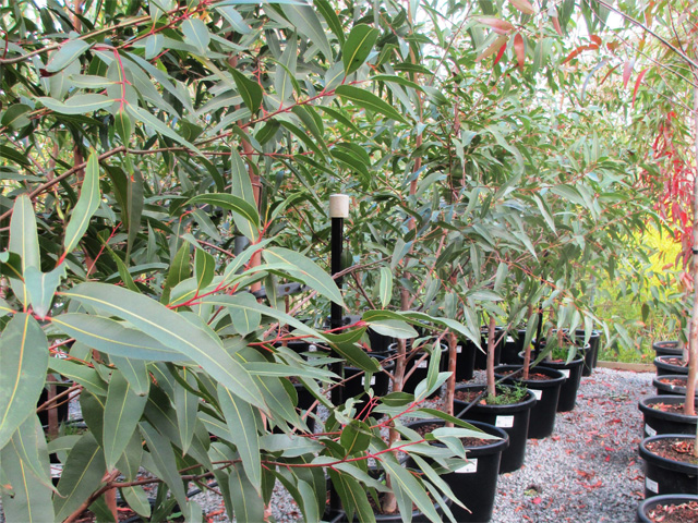 A beautiful, tall growing tree with a distinctive, often powdery white to grey coloured bark which curls and flakes off in spring. Its leaves are green, long and slender with an amazing, strong lemon fragrance when crushed. Its strong scent is a distinguishing attribute, with the essential oils produced from this variety often being used in fragrances as well as insect repellents. In summer and autumn, feathery white flowers appear, making it a good source of food for honey bees.