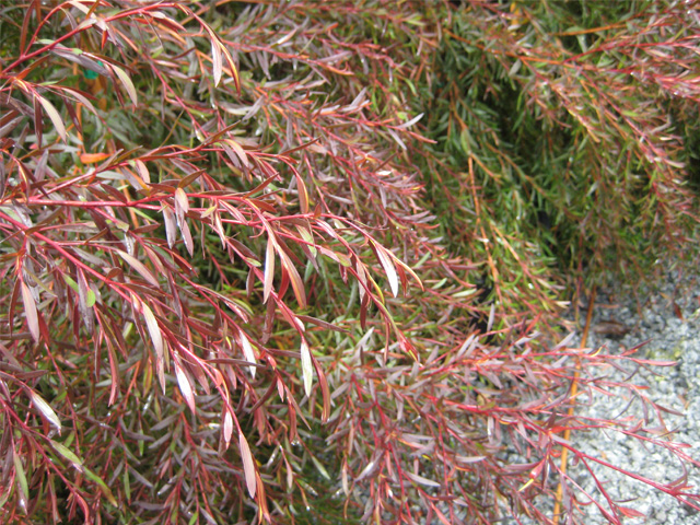 A versatile, fast-growing shrub with fine, deep purple foliage forming a graceful, weeping habit with its purple-pink new growth. In late spring and summer, bronze buds open to a profusion of long-lasting snowy white flowers. A great Australian native adaptable to a variety of soil types and conditions and can be used as a screen, hedge or specimen plant.
