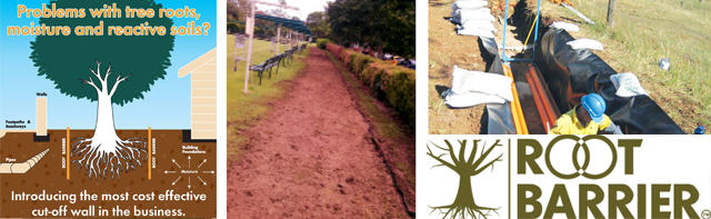 Applications | Flexible waterproof cut-off walls; protect buildings and roads and stabilise moisture in reactive clay; protect infrastructure from root damage; provide a constant moisture zone under new home foundations; landscaping works, retaining walls, root-group separation; contaminated-site isolation and separation; back-of-kerb protection.