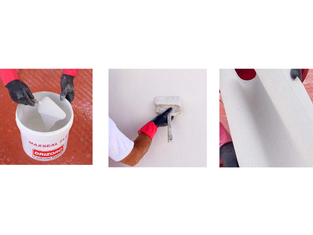 MAXSEAL FLEX is applied with a fibre type brush or broom such as MAXBRUSH or MAXBROOM respectively, or by trowel when a smooth finish is required. For large areas MAXSEAL FLEX can also be sprayed, recommended nozzle size is 3-4 mm and spraying pressure between 3.5 and 5.0 bar. When sprayed, it is recommended to finish the fresh coat with a broom to make sure that the whole surface is covered completely. Apply two coats, using 1 – 1,5 kg/m2 of MAXSEAL FLEX per coat and allow a minimum of 14 hours and a maximum of 3 days between applications. Prior to application thoroughly wash down and saturate the surface, but do not leave free standing water. Thickness per layer should be 1 mm. approximately, it is very important to avoid very thin or, thick application. In those areas such as fissures, concrete joints and active cracks should be sealed using Maxjoint Elastic, once repaired and sealed, MAXSEAL FLEX should be applied with a fibre glass mesh of 40-60 g/m2. Place the mesh on a first coat of MAXSEAL FLEX, with at least 20 cm wide of strip, and then apply a second coat of MAXSEAL FLEX.