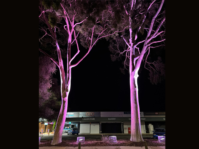 The brief was to illuminate the iconic gum trees that line the precinct, transforming them into visual landmarks and drawing attention to the area's natural beauty. The lighting also needed the flexibility to shift colours for key celebrations and commemorative events throughout the year.