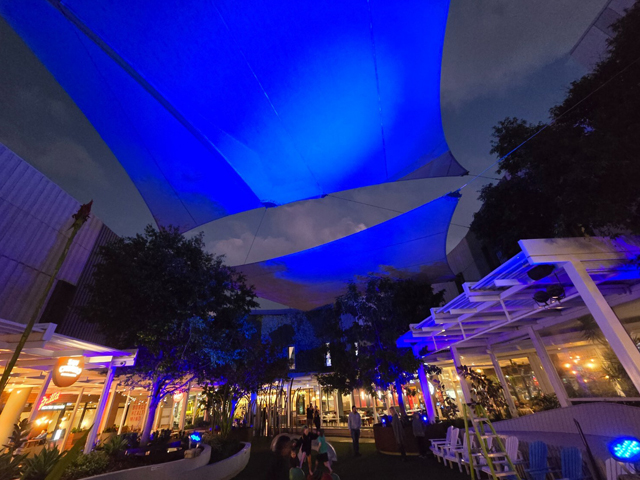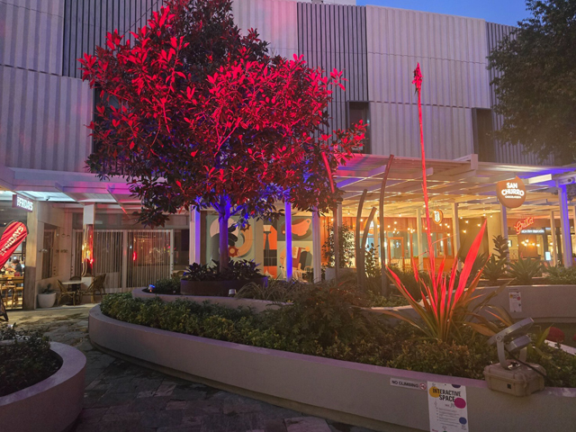 Surrounded by popular bars and eateries, the open-air food court offers a lively social atmosphere — and now, a coordinated lighting display that brings the space to life after dark. Integrated Power’s design focused on illuminating the many large potted trees throughout the area, using colour and light to elevate the nighttime ambiance and highlight natural features.