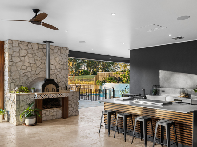 The Aspens' light hues create contrast inside and out and has been paired here with Travertine in the alfresco areas. The stonework blends the inside and out, demonstrating the versatility of stone cladding for all spaces.