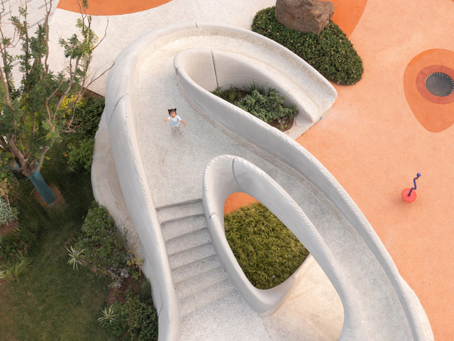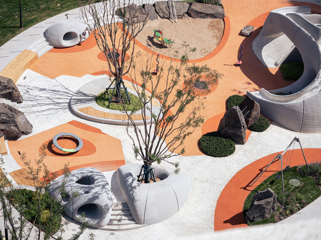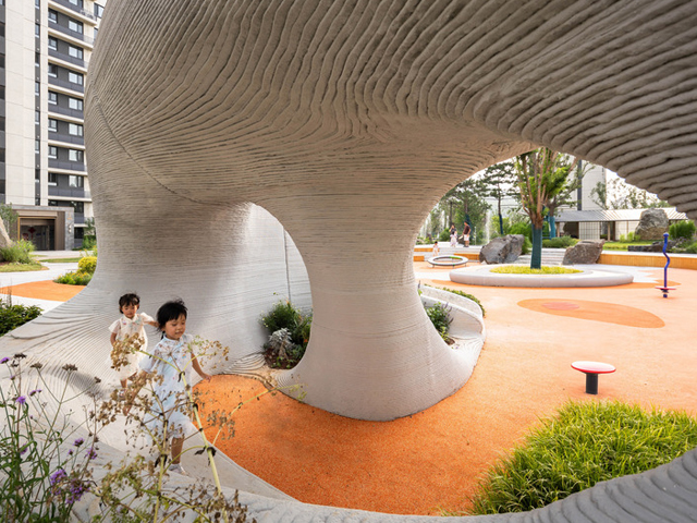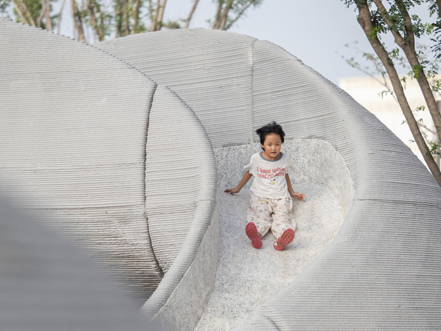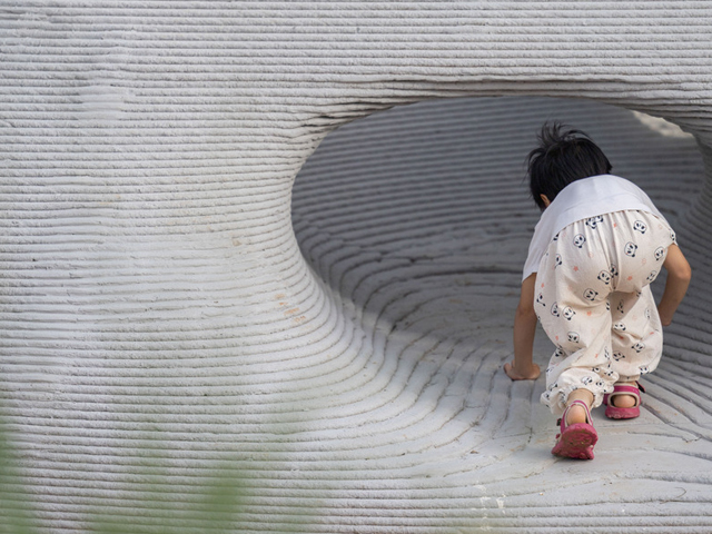 Boulder Park, a community playspace in Ji'nan, has used 3D concrete printing to create large, child-friendly boulders as the central design element. The new technology allows unprecedented freedom in the spatial design and construction, also ensuring no sharp edges for kids climbing about.