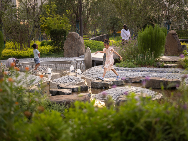 Boulder Park occupies the central area of Yunwan Garden in Ji'nan. The space functions as a comprehensive community park combining a children’s playground, shallow stream water activities, family interaction and leisure. According to the style characteristics and functionality, the park is divided into multiple areas: