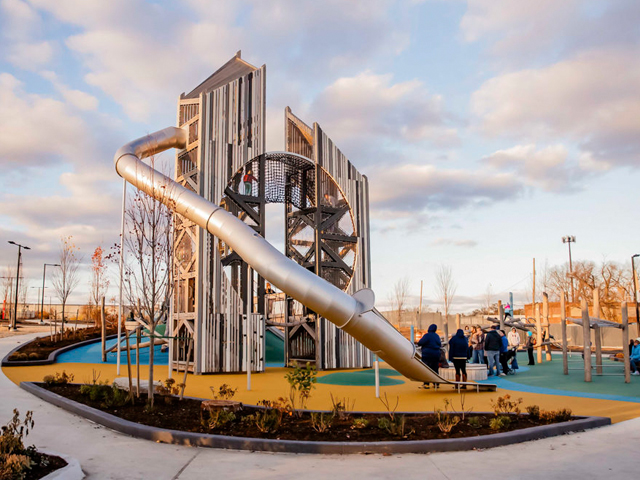 Anchored by a dramatic round timber tower connected by a 50-foot bridge, this project is proof that wood doesn’t limit ambition. Supported by steel reinforcements for structural integrity, the tower complies with Playground standards while delivering a bold, neutral landmark that encourages vertical exploration and panoramic views.