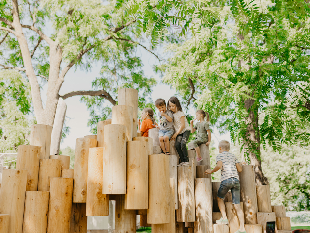 This nationally celebrated nature play destination in the heart of San Francisco embodies the principles of non-prescribed, open-ended play. Timber steppers, carved logs, and custom climbing elements immerse children in natural textures and forms—designed to evolve with the landscape over time.