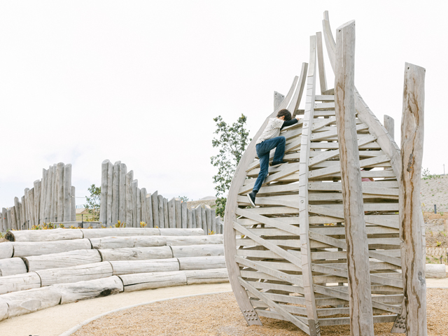 Designed to disappear into its natural surroundings, Pennant Park exemplifies how play can become part of the landscape. Ribbon-like timber forms flow across the site, inviting children to climb, balance, and explore from one end to the other. Varying heights, levels of transparency, and play difficulty create a diverse range of opportunities and challenges, while natural wood finishes provide a timeless appeal and a muted palette that complements rather than competes with the setting.