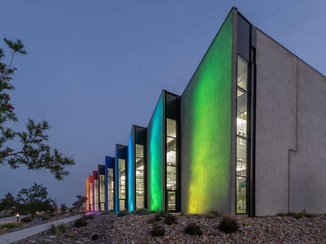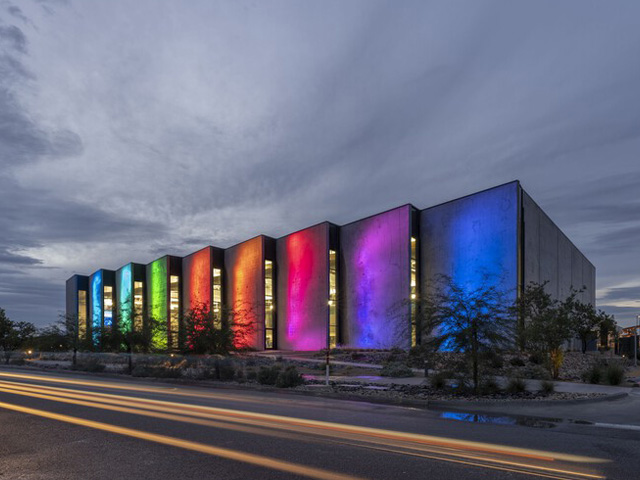 In support of a city-led regional coloured lighting initiative, the south façade of the complex is illuminated at night in a variety of vibrant colours inspired by the flora within the public art display.