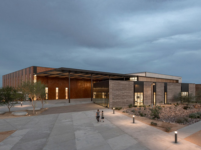 Alongside the wealth of health spaces, the recreation centre includes a public art display by artist Brad Goldberg, inspired by the Hueco Tanks State Park. Embracing the surrounding natural environment, the public art display also acts as an outdoor community space with boulders to take a seat on. The display also includes a range of soft landscaping suitable to the desert environment.