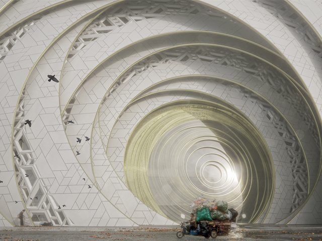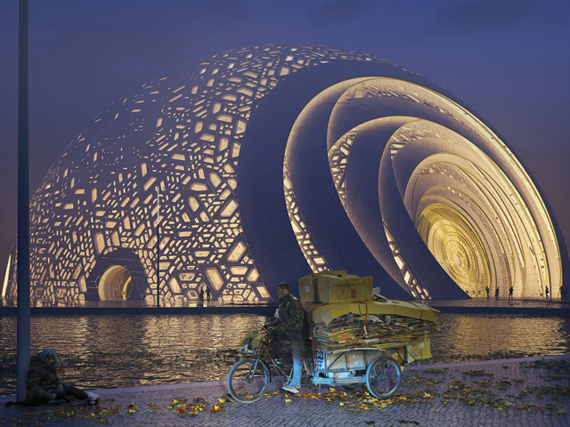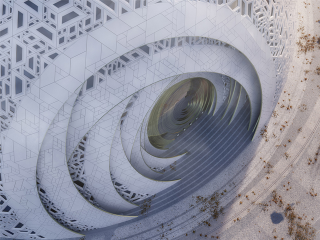 Tubular steel pieces will form a twin-layered dome. The spherical form will be covered in panels of glass fibre reinforced concrete, which will provide a rainscreen for an underlying layer of aluminium panels and glazing. The asymmetric, overlapping patterns of the panels will form geometric designs that will be carved to reference local wooden window shutters.