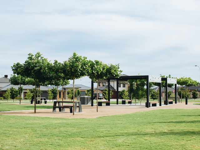 Another great example of trees used well in a park is the Redstone Main Park located in Sunbury. Here FLOW created a plan featuring large mature trees in prime location to ensure the park benefited from shade and a sense of maturity before many of the residents of the estate even moved in.