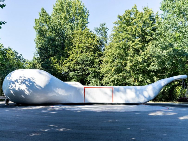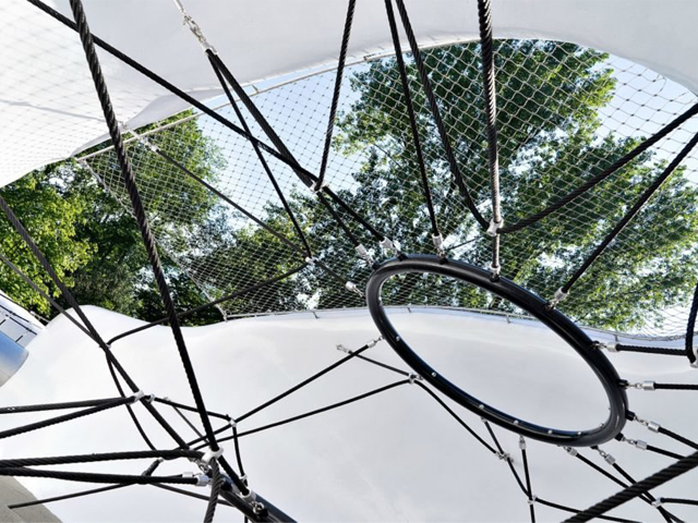The unique structure is a large voluminous form whose curious shape invites children to explore the interior where they’ll find plenty of places to run, climb, slide, and swing. The large blob, which is painted a bright lilac on the inside, was designed with plenty of dynamic areas such as a web of climbing nets, a metal slide, and a tube swing hanging from one end.