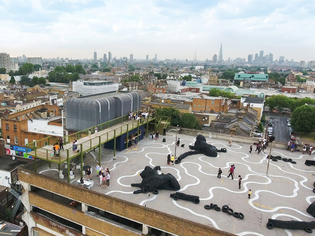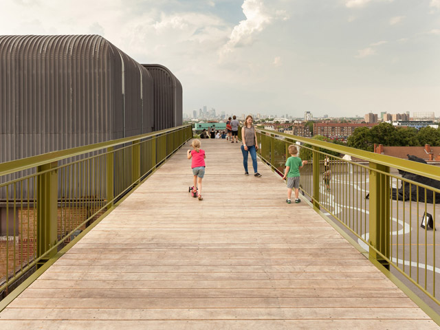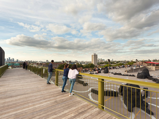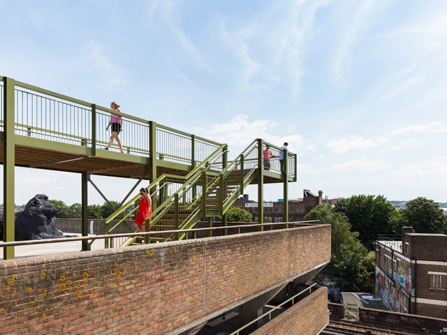Architecture studio Cooke Fawcett has built an elevated walkway and boardwalk atop a multi-storey car park in south London, a space that is also used as an open-air gallery by arts organisation Bold Tendencies.