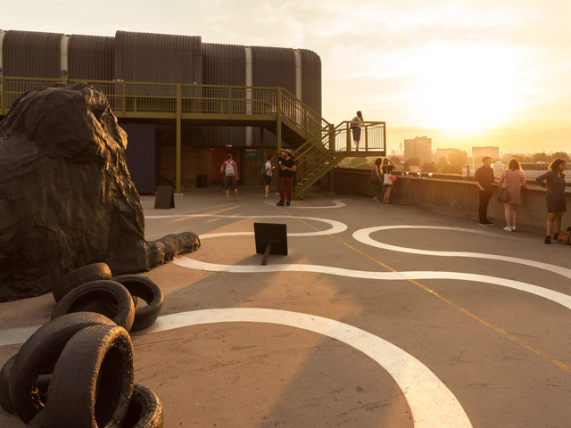 Apart from the interesting cityscape views, the observatory overlooks the carparks temporary art installations commissioned for the space – this year a group of lion sculptures by Ewa Axelrad and a set of poll-mounted wigs by artist Isaac Olvera.