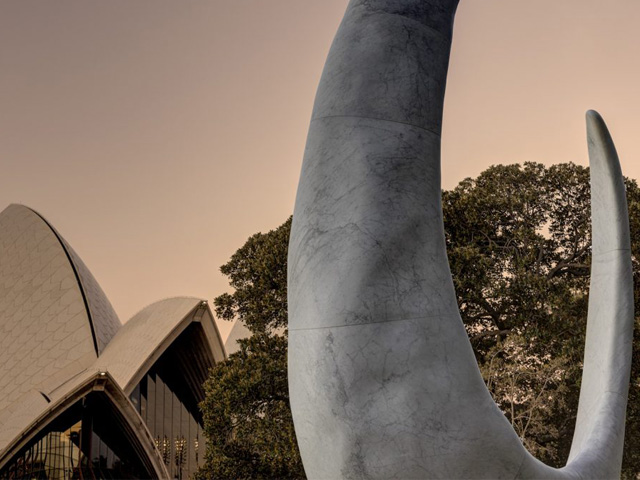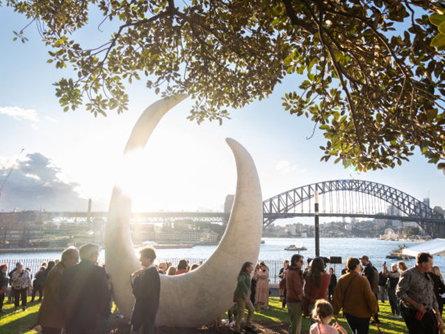 The six-metre-high marble monument stands strong at the edge of Bennelong Point overlooking Circular Quay. Bara translates to shell hook which artist Judy Watson tells she was inspired by a shell fishing hook that is handcrafted and used by local Aboriginal and Torres Strait Islander women for many generations.