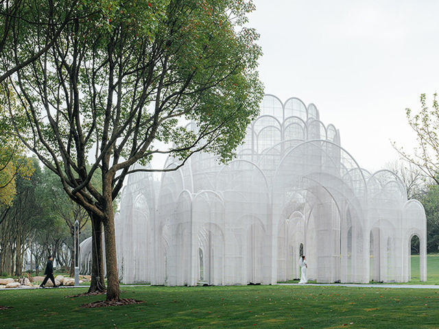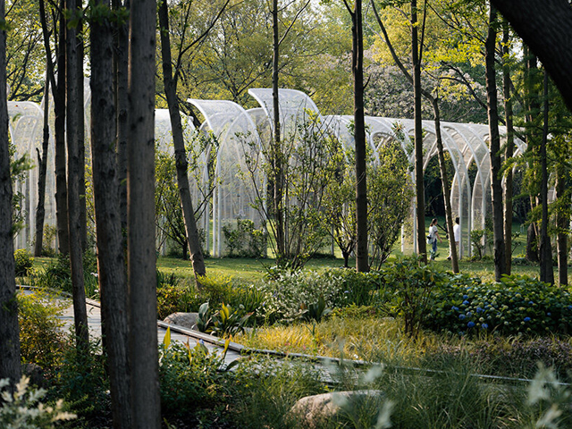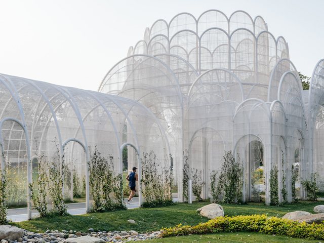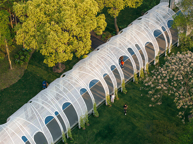 Nearly a kilometre long, the Emerald Screen Pergola on Bogong Island, China, pays homage to traditional Chinese architecture, using an intricate design to create corridors and pavilions. Wutopia Lab's creation is currently bare, displaying the white mesh core, but will soon be covered with greenery as plants climb the structure.