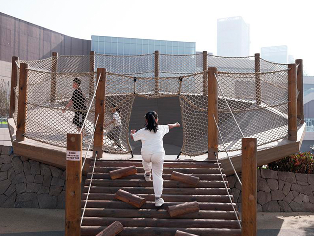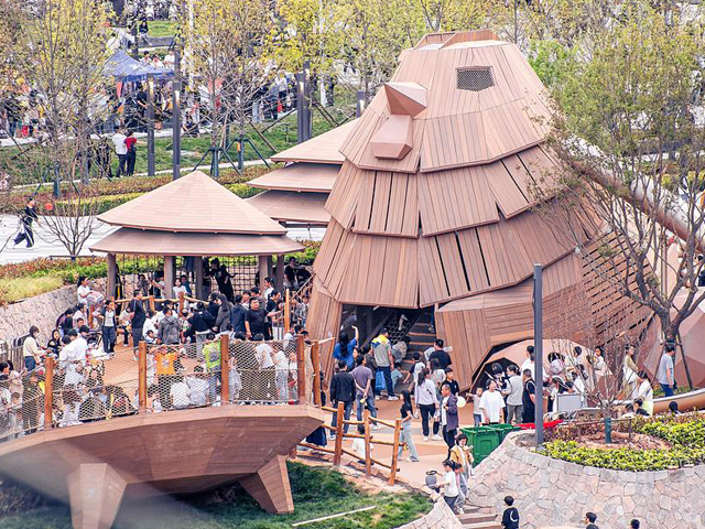 Drawing inspiration from Handan's distinct historical symbols, the design team incorporated elements such as round-topped wooden huts, domestic chickens, millet, and walnuts into children's activity facilities, reflecting the primitive tribal lifestyle of Cishan 8,000 years ago. The use of natural materials, including raw woods, wood-plastic composites, and stones, preserves the features of primitive dwellings and allows children to feel as if they have traveled back to an ancient tribe while playing.