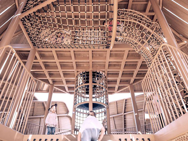 - Tribal wooden house A structure featuring swings, climbing nets, hanging ropes, and a pavilion for resting, reflecting the architectural style of ancient Cishan dwellings, characterized by domed wooden structure.