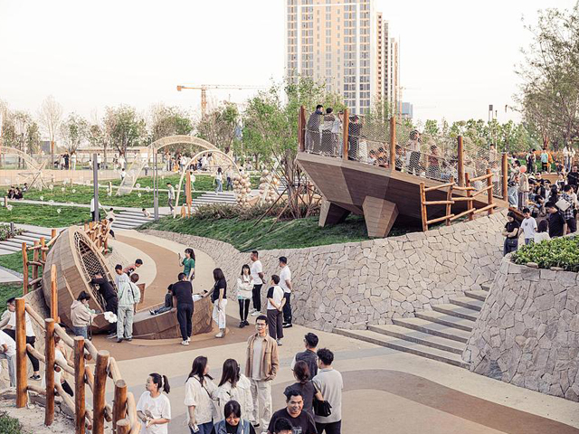 The vision was to create an outdoor, free children's activity space for the public that would also ignite regional vitality and attract popularity, attention and foot traffic to the commercial center. The design by XISUI, covering approximately 3,200m2, integrates Handan's distinct historical symbols to immerse children in an environment that reflects the lifestyle of the Cishan tribe 8,000 years ago.
