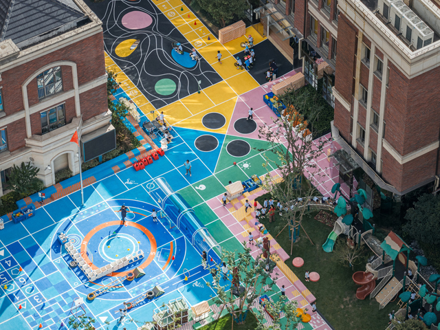 VIASCAPE used the Chinese game flying chess (or aeroplane chess) as the design inspiration for this Shanghai kindergarten. With four coloured paths taking children on educational journeys through the playground, the result is a playful schoolscape that encourages learning and fun!