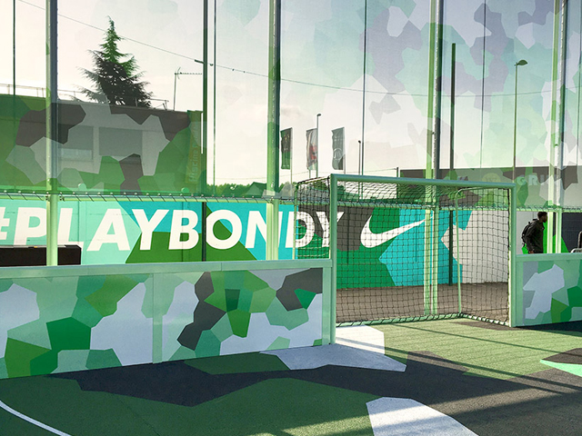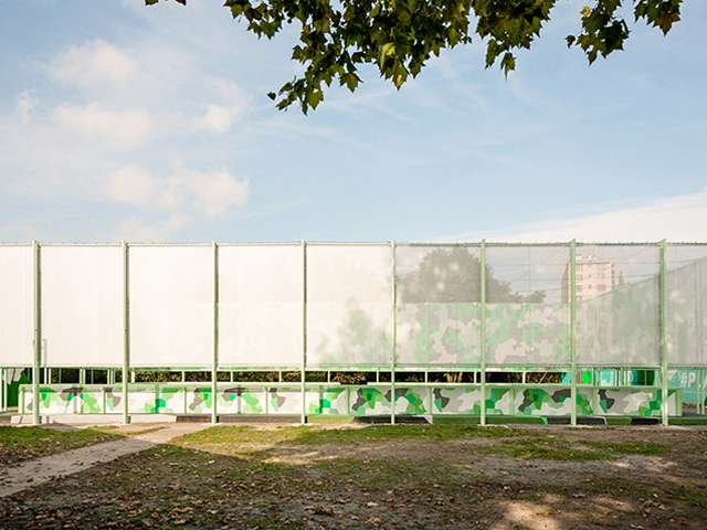 The former asphalt plot has been transformed into a permeable box, enclosed with a translucent fabric screen. Starting from the field itself, a consistent visual treatment expands to the surrounding space, creating a strong identity. The scheme’s primary colour is green, (the colour of Bondy), while the abstract camouflage pattern reflects the concepts of challenge and confrontation.
