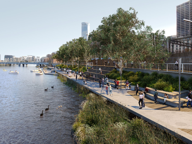 Designed by OCULUS in close collaboration with Riverlee, the City of Melbourne and the broader Greenline project team, the new park includes spacious green lawns, a riverside promenade, children’s play area and multi-use open spaces. The design draws on the area’s maritime legacy – embracing the city’s industrial roots while also acknowledging Melbourne’s significant Indigenous cultural heritage.