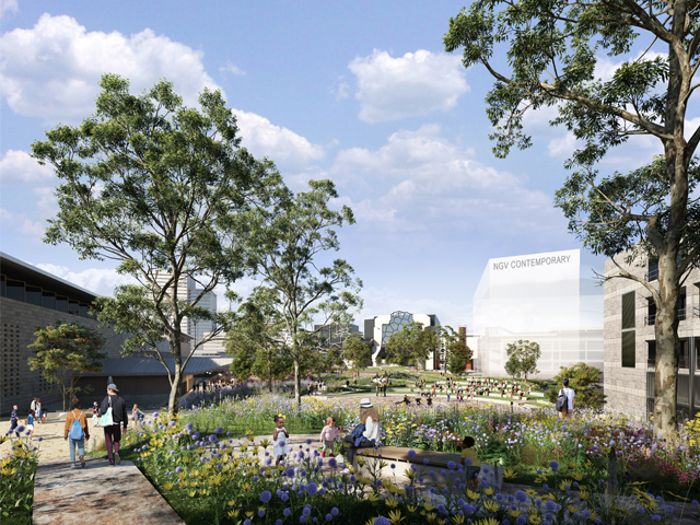 Artist impression of NGV Contemporary (gallery building to be designed) viewed from the new public garden. HASSELL + SO-IL