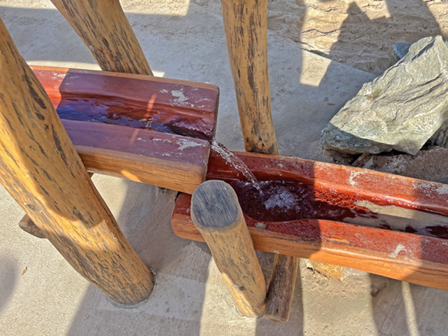 Play Workshop uses timber and sandstone pieces to catch and direct the flow of water to be a shallow pool for splashing, or a trickle that ebbs and flows and can drive leaf boats throughout the channels.