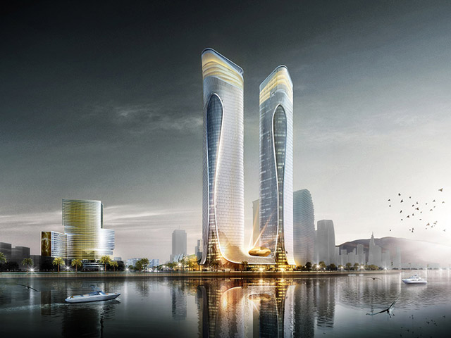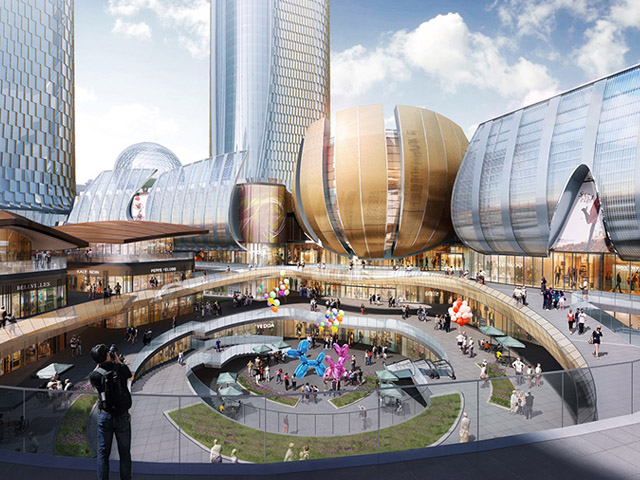 Overlooking some of the largest casino resorts across the river, the vast scheme comprises two high-rise office towers, as well as a series of retail, banquet, entertainment and leisure venues. Several public art sculptures will act as local landmarks and activate the surrounding public space.