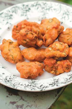 - Carefully drop tablespoons of mixture into the oil, in batches, and cook until golden all over. Remove with tongs and drain on absorbent paper, sprinkle with salt and serve warm or at room temperature with lemon wedges.