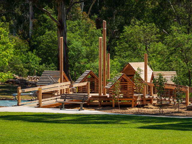 Built to handle Australian conditions, the structures installed include a ‘mining village’ comprised of a series of accessible low-level ramps and bridges interconnecting a cluster of cubby houses, a unique timber climbing structure designed to offer physical challenges and maximum play value, alongside swings, slides and a ropes course, as well as a spectacular flying fox.