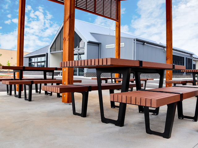 In keeping with the ethos of the school building blitz, Furphy’s furniture range was designed and manufactured with inclusivity and sustainability in mind. Utilising a robust design for high-traffic environments, the Flinders picnic settings offer students a sturdy place to gather and eat together. Made from wood-plastic composite (WPC) over a powdercoated, hot-dipped galvanised steel frame, the settings are 100 percent Australian made and built to handle long-term use in harsh climates. Environmentally friendly, highly durable and versatile, WPC is most typically manufactured from a 50/50 blend of wood products and plastics. It will not corrode and is highly resistant to rot or decay.