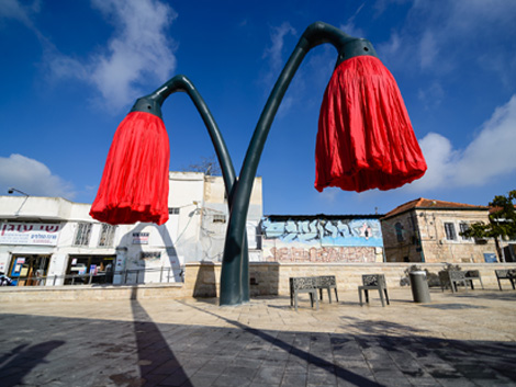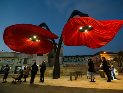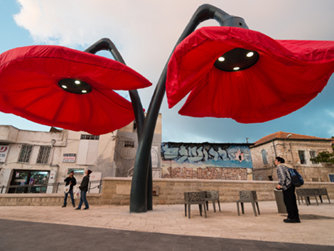 In Vallero Square, Jerusalem, a unique installation of giant flowers has been mounted in an open market square in the heart of the city that blooms and reacts to the pedestrians and transportation in the public space.