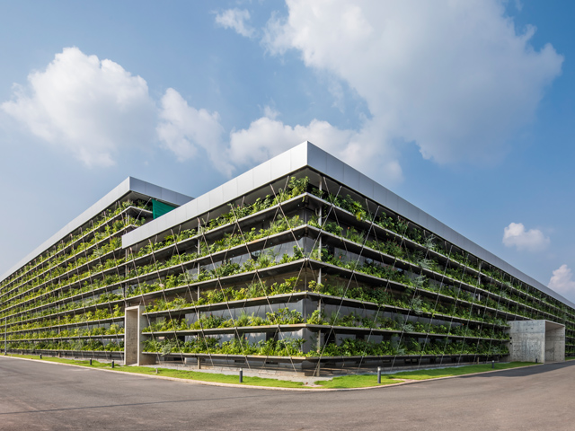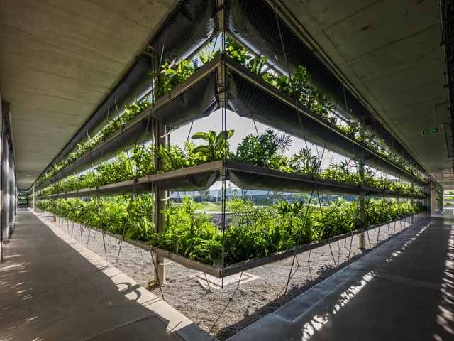 The imposing facades of the structure offer a series of horizontal geotextile planters running along its length top to bottom, fronting a breezeway that sits between the outside and the interior factory space. More than just an attractive array of plantlife that cuts across the concrete predominance of the industrial landscape, this greenwall serves an important function in passive design. Offering both shade and rain protection, the porous façade forms a barrier that acts as a ‘skin’ that contributes to the lowering of the atmospheric temperature on the site through evaporation. A suspended structure supported by a two-layer rope network, the planter system also purifies the air and acts as a dust particle binder, ensuring a better quality environment for workers.
