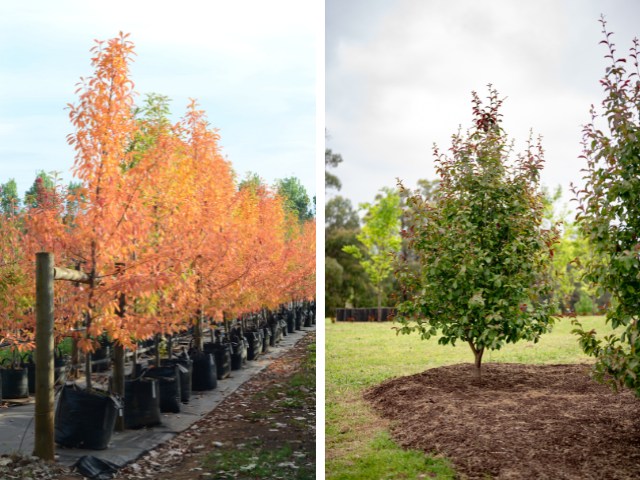 First and most impressive of the autumn foliage trees are the Lipstick® Maple Trees range. Including Acer x freemanii Autumn Blaze®, Acer rubrum ‘Fairview Flame’ (PBR), Acer rubrum October Glory®, and the newest addition: Acer rubrum 'Frank Jr’ Redpointe. Each of these north American maples will deliver outstanding autumn colour and all feature a very uniform tree structure that make them a knockout as a street tree, avenue or a feature tree.