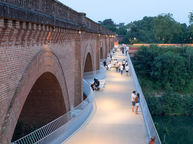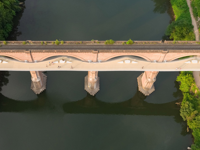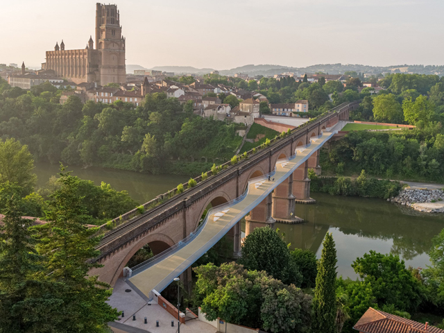 A footbridge in Albi, France, has been designed to meander in and out of the arches of a 19th-century viaduct, a beautiful example of modern architecture harmonising with existing structures.